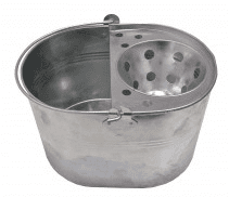 Mop bucket with wringer allows you to press excess water from the mop head. 12 litre Galvanised Mop bucket and wringer Side pouring lip for easy dispersal of water.
