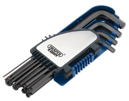 Hexagon keys with ball end on the long arm and conventional ends on short arm. The ball type hexagon tip allows the hexagon key to be used up to 30° angle from the screwhead recess. Manufactured from chrome vanadium steel that's hardened and tempered then applied with a chemically blacked finish. Supplied in fold-out easy release holder which can be wall-mounted.