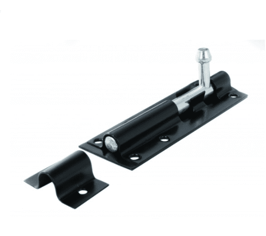 A simple, strong and resilient surface mounted tower bolt used for garden gates and other utility doors. - Black Finish