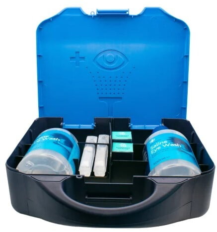 Scan Eye Wash Station supplied in a compact 'briefcase' style eye wash kit box can be wall-mounted. The saline eye wash is sterile and for irrigating eyes in an emergency situation.