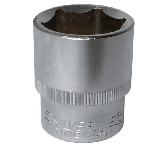 6-point hex socket for maximum torque transfer to the face of the fastener. Precision cold-forged, hardened and tempered chrome vanadium steel. Fully polished and nickel chrome-plated for durable corrosion resistance. Chamfered ends and thin walls for positive location on fastener. Knurled ring provides grip and control in the hand, and bearing hole provides solid connection to the tool.